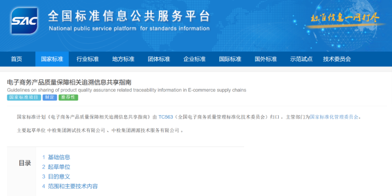 日前,由中国中检测试公司牵头、中检溯源公司参与制定的国家标准《电子商务产品质量保障相关追溯信息共享指南》成功立项,该标准归口全国电子商务质量管理标准化技术委员会(TC563)统一管理。