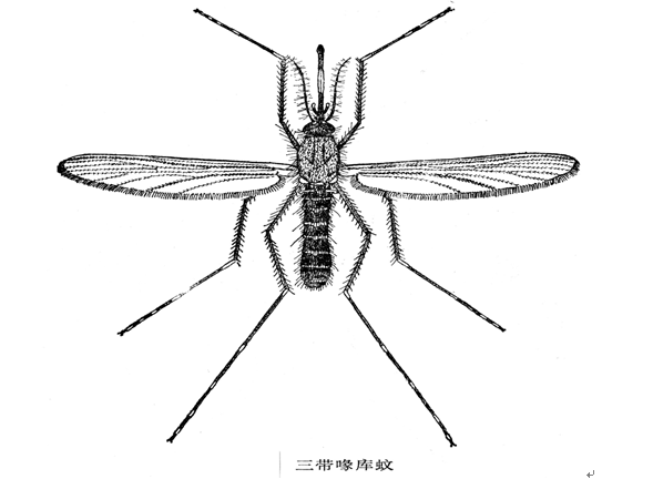 4、三带喙库蚊:翅无白斑,跗节有白环,喙约中央处有白环